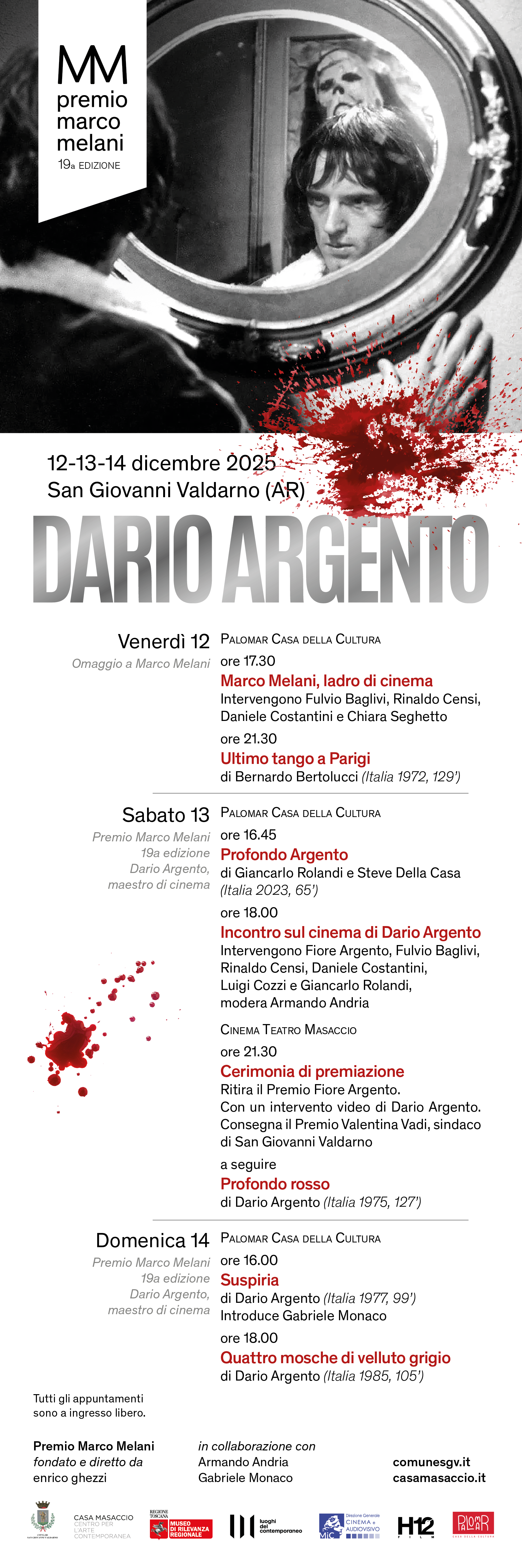 Sarà Dario Argento, uno tra i più acclamati registi italiani nel mondo, a ricevere il Premio Marco Melani alla carriera, diciannovesima edizione, in una cerimonia che si terrà sabato 13 dicembre ore 21.30 (ingresso libero) presso il cinema teatro Masaccio a San Giovanni Valdarno (Arezzo). Il premio sarà ritirato dalla figlia Fiore Argento, alla presenza del Sindaco di San Giovanni Valdarno Valentina Vadi e dell’Assessore alla cultura Fabio Franchi. Durante la premiazione anche un intervento video da parte di Dario Argento. Il Premio Marco Melani è promosso dal Comune di San Giovanni Valdarno, Casa Masaccio | Centro per l’arte contemporanea, in collaborazione con Associazione culturale H12 – Armando Andria e Gabriele Monaco.